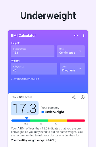 18.5 ထက်နည်းသော BMI သည်သင်အဝလွန်နေကြောင်းဖော်ပြသည်။ အကြံဥာဏ်တောင်းခံရန်သင့်ဆရာဝန်သို့မဟုတ်အစားအသောက်ဝီယန်ကိုအစားအစာများတောင်းရန်သင့်အားအကြံပြုသည်။