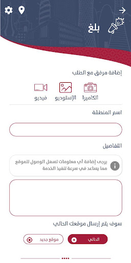 وباستطاعة المستخدم ارسال شكوى مع إمكانية أخذ صورة وارسالها من خلال التطبيق إلى وزارة البلدية بالإضافة إلى كتابة تعليق، مثال على ذلك (بإستطاعتك ارسال شكوى عن مشكلة في شارع مع إرفاق صوة المشكلة او سيارة مهملة أو اشجار سقطت بسبب الرياح ...إلى اخره)