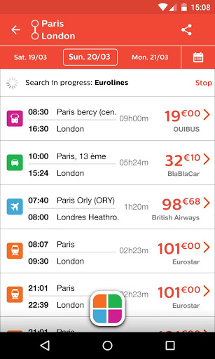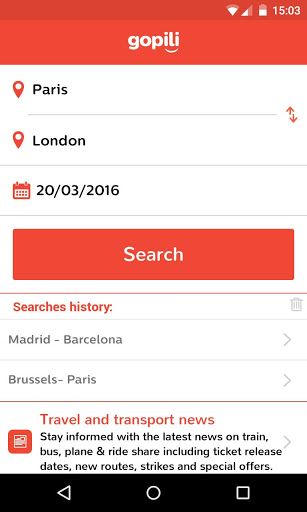 The Gopili app is connected to more than 500 train, coach, plane and ride share companies and provide in few seconds all available offers: Eurostar, National Express, easyJet, Eurolines, Blablacar, Ryanair, SNCF, RENFE and much more!