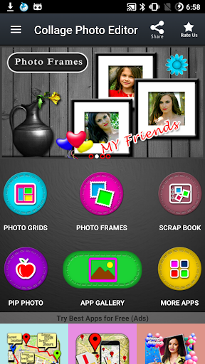 Collage Photo Editor lets you create photo collages, free collages, creative photo frames and pip photo frames of Hundreds of layouts.