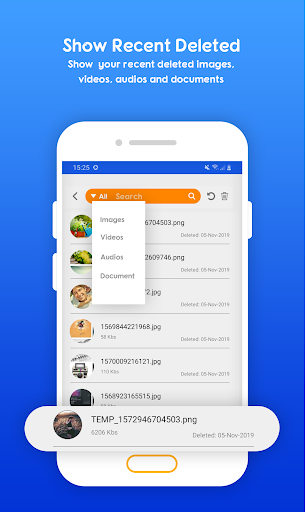 အက်ပလီကေးရှင်းသည်သင့်အားဖယ်ရှားထားသောဓာတ်ပုံများ, ဗွီဒီယိုများ, အက်ပ်များ, အသံနှင့်စာရွက်စာတမ်းများစသည့်သင်၏ဖယ်ရှားထားသောအချက်အလက်အားလုံးကိုအလိုအလျောက်အရန်ကူးယူသည်။ Deleted Video Recovery အက်ပလီကေးရှင်းဖြင့်ထောက်ခံသည့်သင်၏လတ်တလောဖျက်ထားသောဖိုင်များကိုစစ်ဆေးပါ။