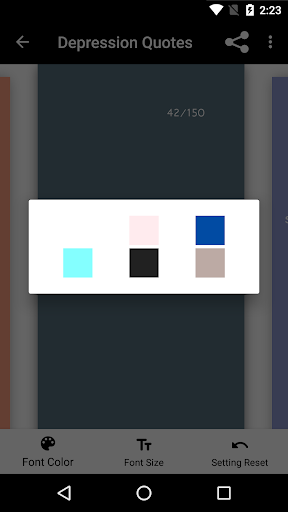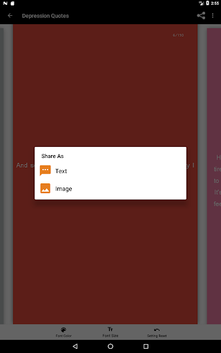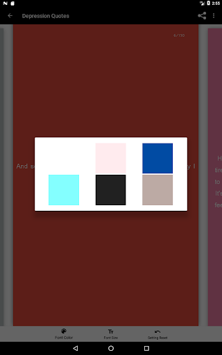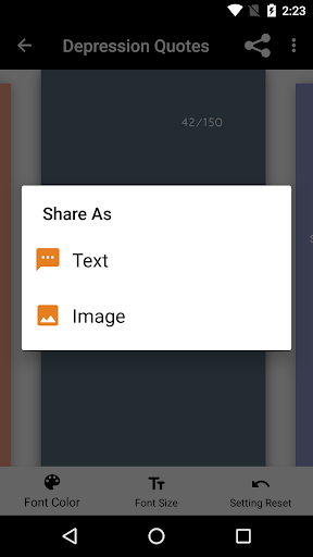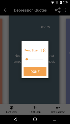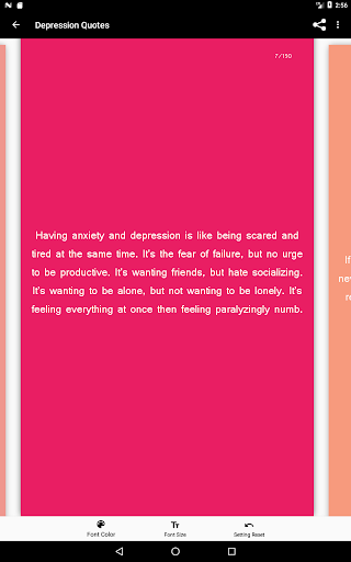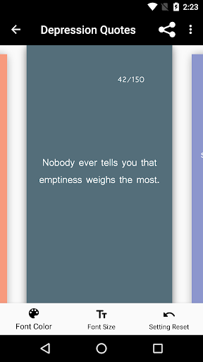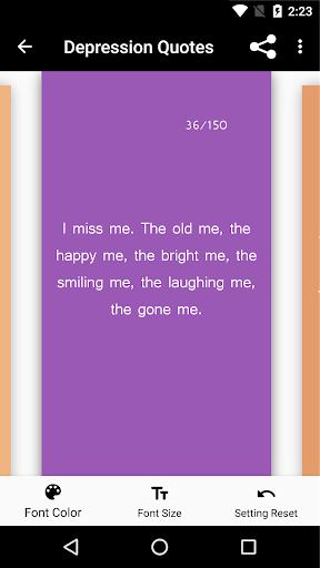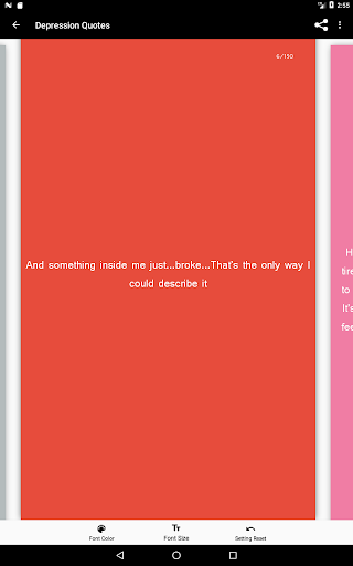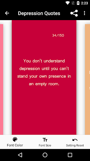 and be able to fully express yourself. Swipe through the 150 depression quotes and find the quote that shows how you feel. You can change the text color and size according to your needs and overcome your depression by telling your friends and family how you really feel with the quotes provided inside this app.