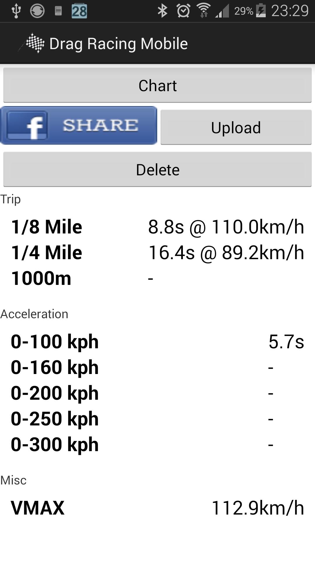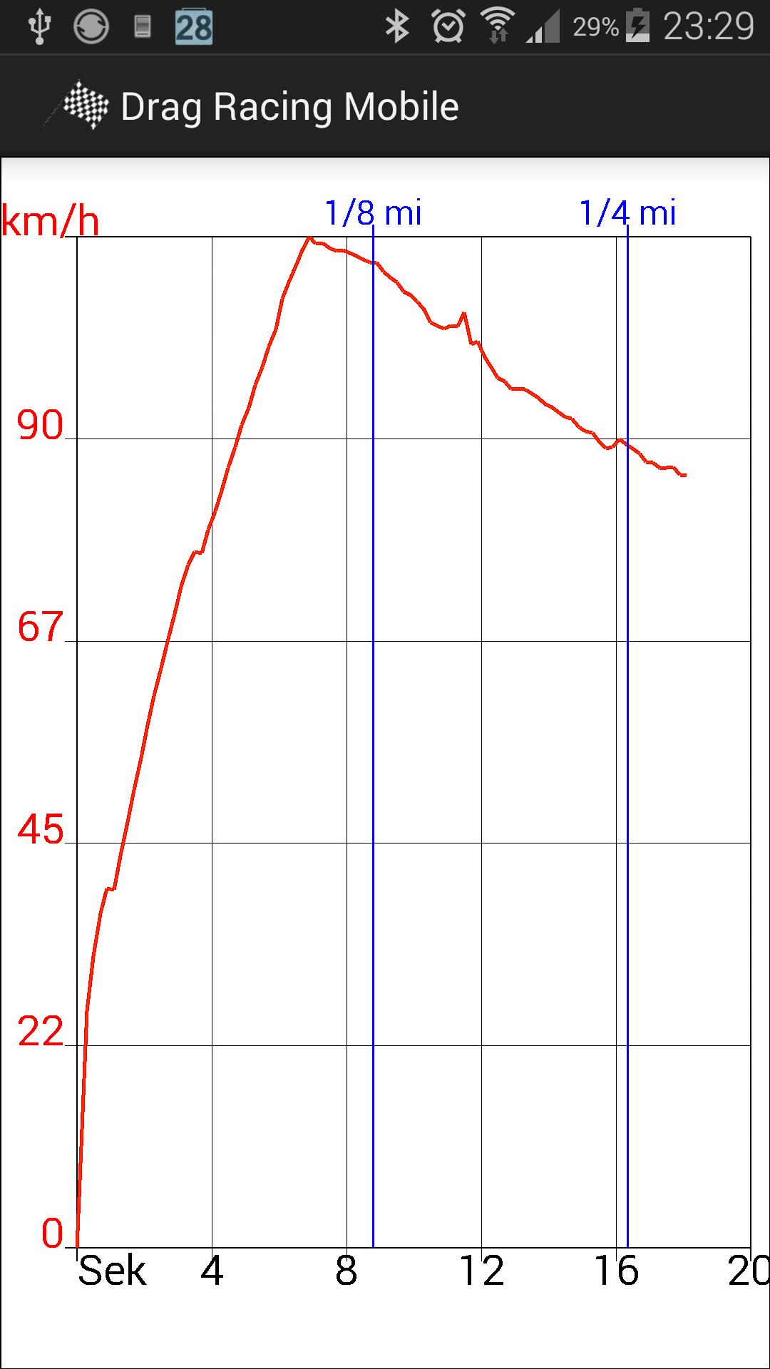 Drag Racing Mobile uses a built-in GPS receiver of a Android phone for the measurement of the acceleration of a vehicle - no matter what vehicle. This APP uses the traditional race track lengths of the acceleration competitions (1 / 8 miles, 1 / 4 miles, 1 km). The results will be nicely displayed in a tabular form and showed as a diagram. The results can be mailed or shared on Facebook. At the same time you can compare your results and time marks with your online community, friends or forums. Our page also saves your personal results and makes it possible to compare the results of different types and brands of all the drag mobile users. Also at the end you can see, who the winner is.