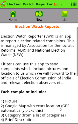 ရွေးကောက်ပွဲကော်မရှင်အရာရှိများထံပို့ဆောင်မည့်ရုပ်ပုံများနှင့်တည်နေရာများပါ 0 င်သည့်တိုင်ကြားချက်များကိုပေးပို့ရန်ဤ app ကိုသုံးနိုင်သည် အိန္ဒိယနှင့်သက်ဆိုင်ရာရွေးကောက်ပွဲလေ့လာသူများစသည်တို့ပါဝင်သည်။