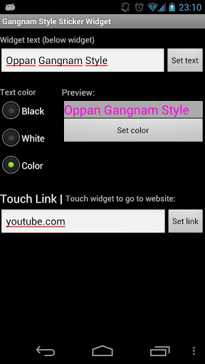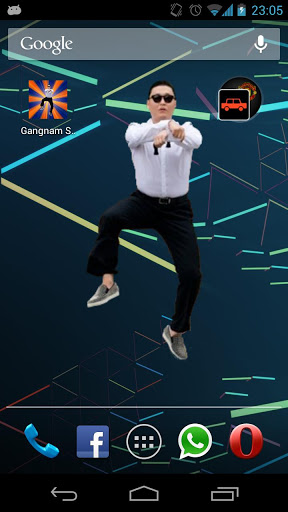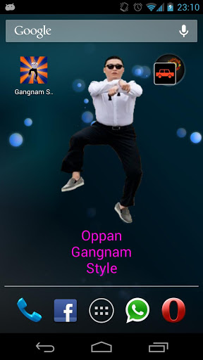 Psy on your home screen? With this widget it39;s possible Who wouldn39;t want a Gangnam Style dancing Psy on the home screen?Gangnam Style, the most liked video EVER on YouTube. Get the widgetCheck the screenshots for size and looks.InstallationAndroid 4.0: Go to the widgets tab of your app drawer, select long press and place it on the desired location at your home screen.Other android versions: Long press home screen, select widgets, find Gangnam Style Sticker Widget and placeat desired location.DISCLAIMER:We are in no way affiliated with Psy and this app is just a fan made app.Errors, feedback, suggestions for appswidgets? flowappsinfo at gmail dot comA bit of information about Gangnam Style:quot;Gangnam Stylequot; Korean: is a single by South Korean rapper Psy. The song was released on July 15, 2012, as the lead single of his sixth studio album PSY39;s Best 6th Part 1. quot;Gangnam Stylequot; debuted at number one on the Gaon Chart, the national record chart of South Korea. The music video has been viewed over 359 million times on YouTube, making it the site39;s most watched Kpop video.The video has been shared on the Internet by numerous celebrities including TPain, Katy Perry, Britney Spears, and Tom Cruise, covered by music artists Nelly Furtado and Maroon 5, and featured in international media outlets such as CNN International, The Wall Street Journal, the Financial Times, the Harvard Business Review, and the global politics magazine Foreign Policy. quot;Gangnam Stylequot; flash mobs have appeared in cities around the world. The video has become a source of parodies and reaction videos by many different groups including The Oregon Duck, midshipmen from the United States Naval Academy, and the North Korean government. Psy has brought the quot;Gangnam Stylequot; dance to various locations including The Today Show, saturday night live Dodger Stadium, The Ellen DeGeneres Show, and Samsung commercials.quot;Gangnam Stylequot; has been highly praised for its catchy beat and Psy39;s humorous dance moves in the music video and live performances. On September 17, the song was nominated for Best Video at the 2012 MTV Europe Music Awards to be held in Frankfurt, Germany. On September 20, 2012, quot;Gangnam Stylequot; was recognized by Guinness World Records as the most quot;likedquot; video in YouTube historyquot;.From: Wikipedia, the free encyclopedia.
