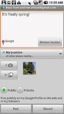 The Google buzz widget allows you to easily post buzz from your home screen.Post buzz from your home screen Quickly post buzz publicly or privatelyn Add photos to your post from the camera or galleryn Share your location or placen Quickly access buzz.google.comAdd to your homescreen by selecting Menugt;Addgt;Widgetsgt;Google Buzz