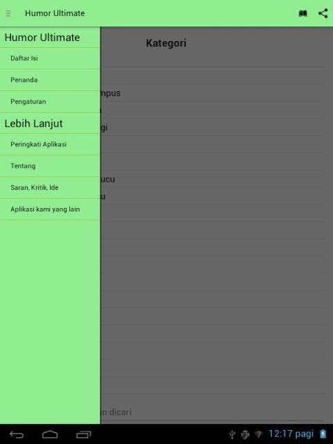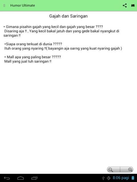 Humor Ultimate. Kumpulan Cerita Humor Paling Terlengkap. Jumlah kumpulan humor dalam aplikasi ini mencapai lebih 9000 buah cerita. Bekerja secara offline sehingga kamu tidak perlu mendownload data cerita lagi.