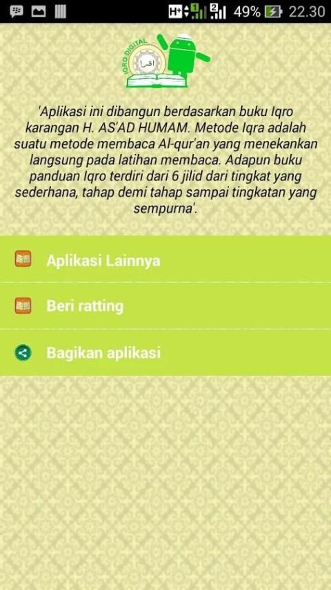 Digital Iqro an application that is education or education in the field of Islamic religion to teach children about the basics in reading the Koran or Qur'an, Iqro is a direct method to practice reading. As for digital Iqro guide consists of 6 volumes of the level of simple, step by step to the perfect level.