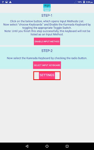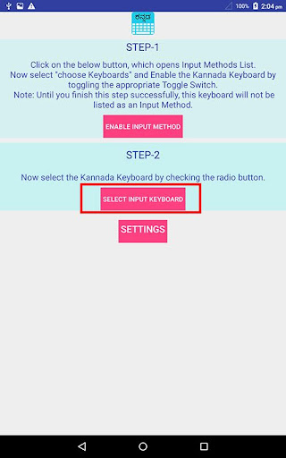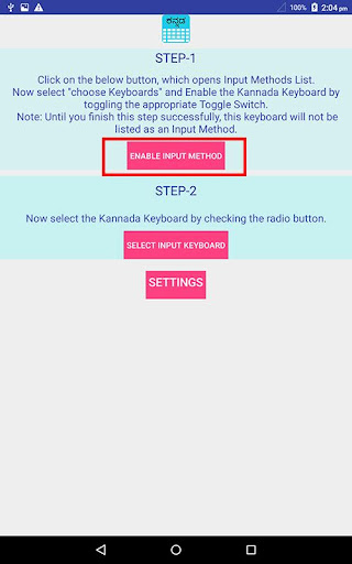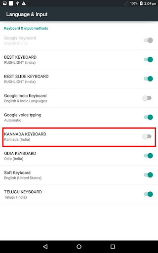2. Go to "Settings"->"Language & input" -> Current Keyboard -> Choose Keyboards & Enable KannadaKeyboard -> Check the "Kannada Keyboard".