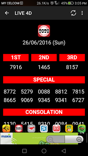 The Best Live 4D Results App for Malaysia included Sabah & Sarawak & Singapore. - Magnum 4D - Toto 4D/5D/6D/Jackpot - Damacai 1 3D - Sabah 4D Lotto - Sandakan 4D - Sarawak Cash Sweep - Singapore 4D