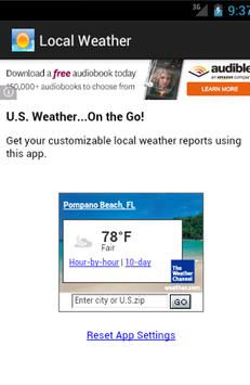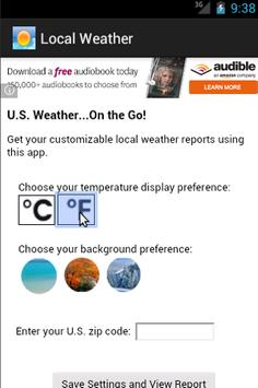 This app will display your local U.S. weather conditions. There are various options you choose to customize the look of your weather report as well. NOTE: You must select from the various options in order for the weather report to display.