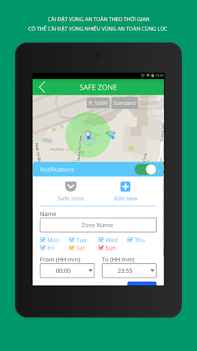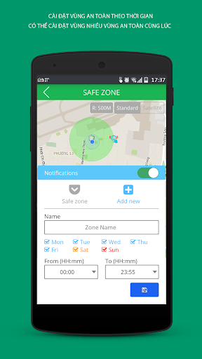 Safe area ရိယာချိန်ညှိချက်များနှင့်ကလေးများသည်လုံခြုံသော in ရိယာသို့သွားသောအခါအသိပေးချက်များနှင့်အသိပေးချက်များလက်ခံရရှိသည်။ အမျိုးမျိုးသော areas ရိယာများကိုတစ်ချိန်တည်းတွင်သို့မဟုတ်တစ်ချိန်တည်းတွင်တပ်ဆင်နိုင်သည်။