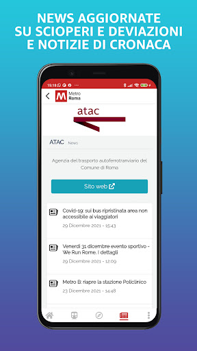 • LIVE NEWS - Ottieni gli ultimi aggiornamenti in tempo reale direttamente dal feed di ATAC. Sarai sempre aggiornato su scioperi, deviazioni di bus, manifestazioni ed interruzioni della linea metro