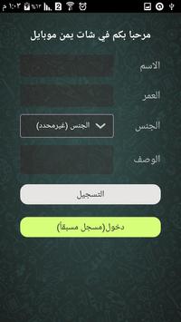 تطبيق الشات : هو عبارة عن تطبيق تواصل وتكوين صداقات ونشر معلومات ترفيهية عبر الرسائل القصيرة بين الأشخاص المشتركين فيه داخل نطاق الجمهورية اليمنية لمشتركي يمن موبايل ، يتم التراسل بين الاعضاء عن طريق اسماء مستعارة لمشتركي يمن موبايل وبالامكان ارسال نصوص ورموز تعبيرية وكذا تسجيل الاصوات وارسالها بطريقة سهله وسريعة
