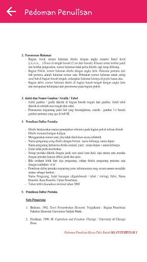 Pembaruan: Aplikasi ini berisi pedoman dan tata cara penulisan karya tulis ilmiah yang baik dan benar menurut kaidah dan aturan yang berlaku. Aplikasi ini bertujuan untuk membantu siswa kelas menengah dalam mengerjakan laporan karya tulis sebagai syarat untuk mengikuti ujian akhir sekolah. dalam pembuatan karya tulis ilmiah ada kaidah dan aturan yang harus diikuti oleh peneliti atau penulis, agar karya tulis itu dapat mudah di pahami dan dimengerti oleh penguji ataupun oleh pembaca.