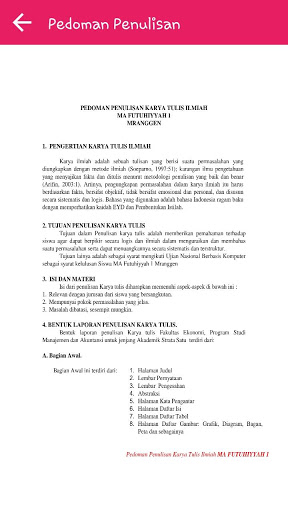 Aplikasi ini berisi pedoman dan tata cara penulisan karya tulis ilmiah yang baik dan benar menurut kaidah dan aturan yang berlaku. Aplikasi ini bertujuan untuk membantu siswa kelas menengah dalam mengerjakan laporan karya tulis sebagai syarat untuk mengikuti ujian akhir sekolah. dalam pembuatan karya tulis ilmiah ada kaidah dan aturan yang harus diikuti oleh peneliti atau penulis, agar karya tulis itu dapat mudah di pahami dan dimengerti oleh penguji ataupun oleh pembaca.