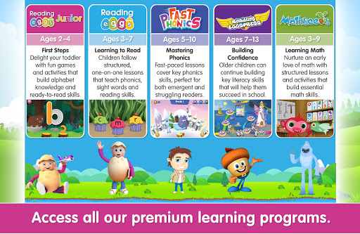 • Reading Eggs Junior (အသက် ၂ နှစ်မှ ၄ နှစ်) - ကလေးငယ်များသည်ပျော်စရာလှုပ်ရှားမှုများ၊ ဂိမ်းများ၊ ဗီဒီယိုများနှင့်ဖတ်ရန် - အသံကျယ်စာအုပ်များနှင့်အတူ phonemic အသိအမြင်နှင့်အက္ခရာအသိပညာစသည့်ကြိုတင်ဖတ်ရှုခြင်းစွမ်းရည်ကိုတည်ဆောက်သည်။ br> •ကြက်ဥများကိုဖတ်ခြင်း (၃-၇ နှစ်) - ကလေးများသည်စာဖတ်ခြင်း၊ အသံထွက်၊ အမြင်အာရုံ၊ စာလုံးပေါင်း၊ ဝေါဟာရနှင့်နားလည်မှုစသည်တို့ကိုလေ့လာရန်ပထမ ဦး ဆုံးခြေလှမ်းများ။