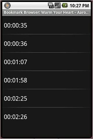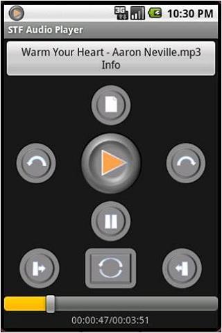 An audio player that remembers the audio clip and it39;s time position where the user last left off.Other features include:bookmarks repeating playback of a defined section of the clip programmable skip forwardbackward time duration Double speed playing for searching a particular section of the audio clipThis audio player is suitable for play back audio clips such as audio book, speeches, language learning, training materials.The usage of the player is pretty straight forward.Additionally: Long Press on the PLAY button brings up the media browser Long Press on the BOOKMARK button to bring up the bookmark browser. In the Media Browser screen, option MENU allows users to list the media by either their file names or their titles. In the main screen, option MENU allow users to program the skip forwardbackward duration.This application will be running in the background if you hit the HOME button i.e., the audio will continue to play.To completely exit the application, simply hit the BACK button from the main screen, which will terminate the audio play and exit the application.Please note that this application is adsupported.Hence the need for the internet access permission.If you like this app, please consider purchasing the paid version STF Audio Player Plus which is Ads free, and contains additional features.