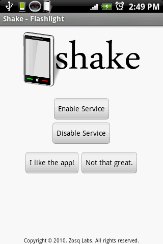 Enable Service app runs in background Shake whenever you need flashlight touch screen to closeWORKS WHEN SCREEN IS LOCKED BUT NOT WHEN IN SLEEPChanges: Long Click to change colorHit quot;View more applicationsquot; below for even more interesting apps. check out Flip 39;n Shake for more features and customizations.