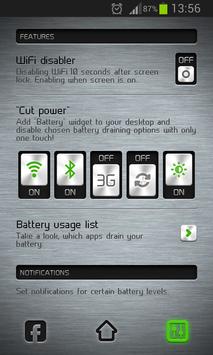 Just place Battery widget on your desktop and then use CutPower whenever you need to enhance your battery lifetime.