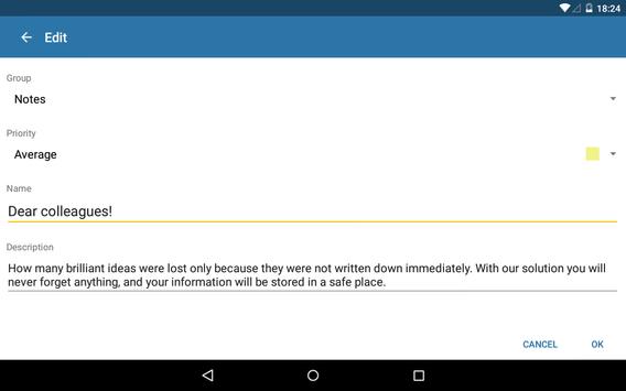 How many brilliant ideas were lost only because they were not written down immediately. With our solution you will never forget anything, and your information will be stored in a safe place.
