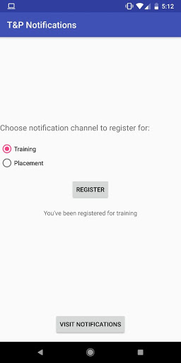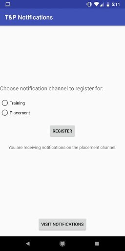 The first T&P Notifications application. Register on either the Training or the Placement channel to receive push notifications.