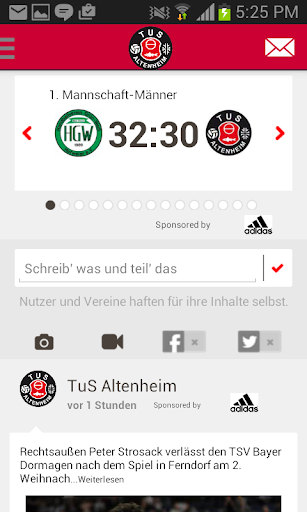 TUS Altenheim ၏လက်ကိုင်ကလပ်အက်ပလီကေးရှင်းများ, သင်၏ကလပ်မှအောင်ပွဲများ, ပြောင်းလဲခြင်းနှင့်အခြားသတင်းများအပေါ်အမြင်များအပေါ်ထားရှိမည်။ အခြားကလပ်အသင်းများ၏ရဲဘော်ရဲဘက်များနှင့်လည်းအက်ပလီကေးရှင်းနှင့်လည်းဆက်သွယ်နိုင်သည်။ ဒါပေမယ့်အဲဒါကိုစဉ်းစားကြည့်ပါ။ ဒီနေရာမှာအားကစားရဲ့အပြုအမူပါ။ သင်ဤနေရာတွင်သင်ပို့သမျှသည်လူသိရှင်ကြားဖြစ်ပြီးအခြားသူများကဖတ်ရှုနိုင်သည်။