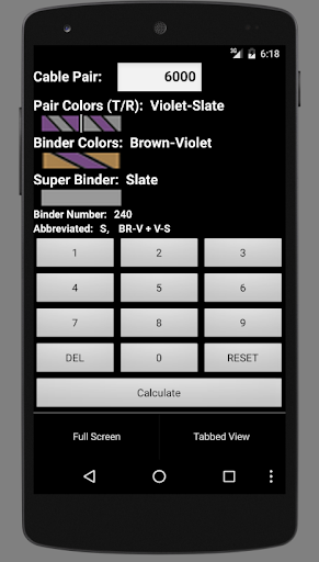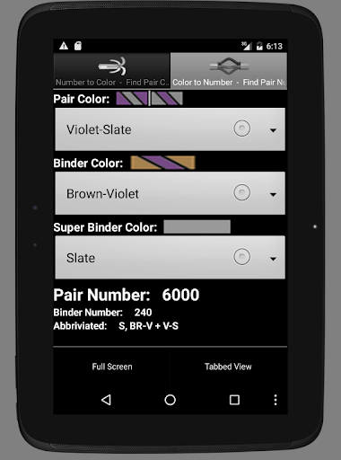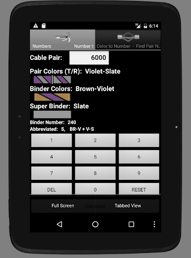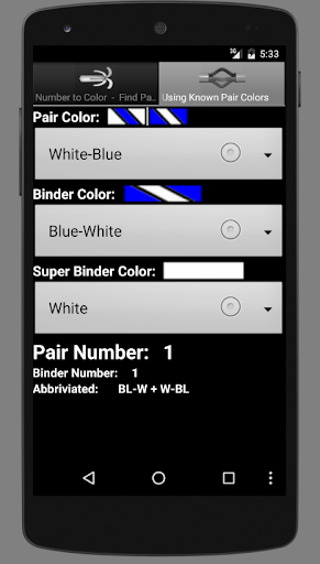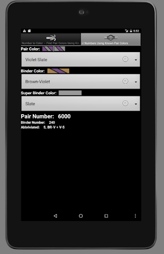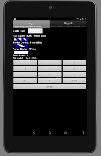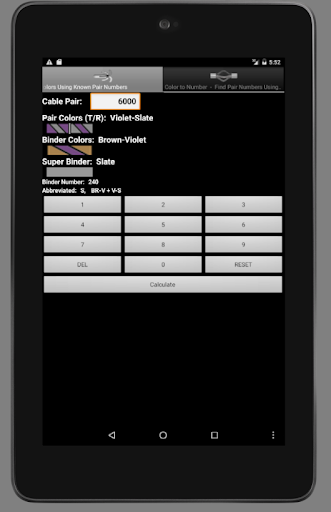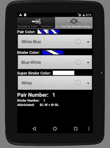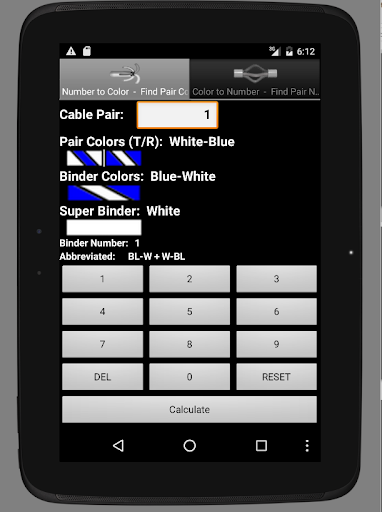 You can type in a cable pair number and it will display the pair color, binder color, binder group, super binder group, and the color abbreviation that this pair would be written in.