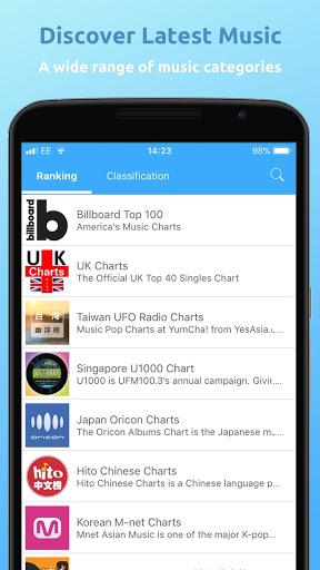 •အမေရိကန်, ယူကေ, ဂျပန်, ကိုရီးယား, တရုတ်, ထိုင်ဝမ်ဟောင်ကောင်, စင်္ကာပူနှင့်မလေးရှားရေဒီယိုရေဒီယိုအသံလွှင့်စက်များရှိသည့်အနေဖြင့်သင်၌ရှိနေသေးသည်။ •သင်ရှာဖွေနေသည့်အရာကိုသင်ရှာမတွေ့ပါ။ ကျွန်ုပ်တို့၏အသင်းသည်သင်အတွက်ထုတ်လွှင့်သူတိုင်းတိုင်းကိုပေါင်းစည်းရန်ကြိုးစားလိမ့်မည်။ •သင်အကြိုက်ဆုံးကိုလက်လွတ်မခံပါ။ Billboard Top Charts List