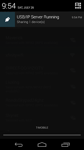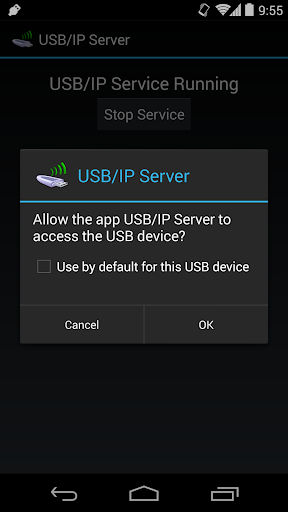 app ၏ USB / IP ဝန်ဆောင်မှုနှင့်ချိတ်ဆက်ထားသော USB ကိရိယာများကိုသင်စာရင်းပြုစုနိုင်လိမ့်မည် သင်၏ Android Device ကို Usbip utility ကို အသုံးပြု. သင်၏ PC မှ။ သင်၏ PC မှ၎င်းတို့နှင့်တွဲဖက်ရန်ကြိုးစားသည့်အခါ USB ခွင့်ပြုချက်ပေးသည့် dialog ကိုသင်၏ Android စက်တွင်ပြလိမ့်မည်။ ခွင့်ပြုချက်ပေးတဲ့ dialog ကိုလက်ခံပြီးတဲ့အခါဒီကိရိယာကသင့်ရဲ့ PC နဲ့ချိတ်ဆက်လိမ့်မယ်။