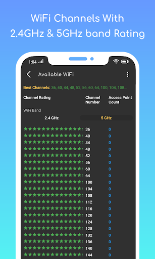 Also get channel number with rating and its access point count for both 2.4GHz and 5GHz.