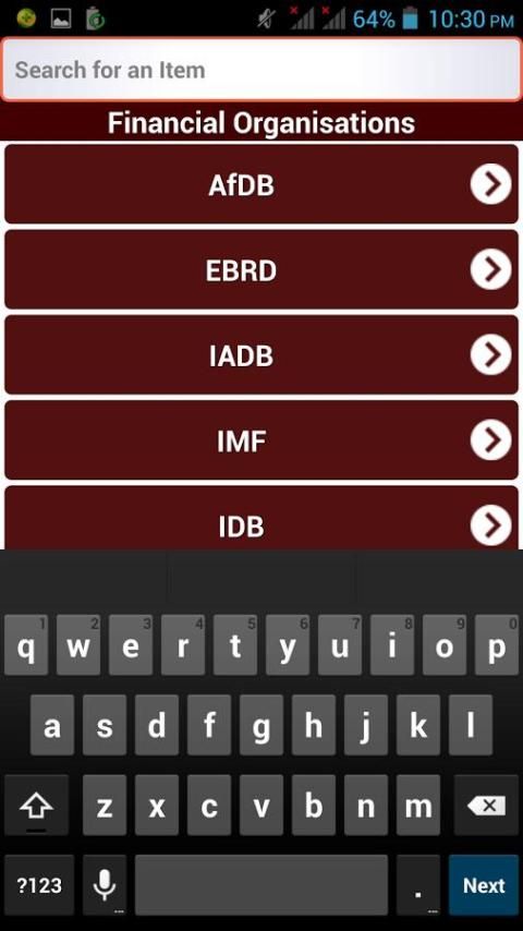 This application used for knowing about all types of World Organisations such as United Nations, Financial, Political and Economical, Sports, etc.., .It is Having Good User Interface for learning Quickly. It provides search functionality so that u can easily search any World organisations.So it is very handy for all kinds of people. Used for general Knowledge.It is mainly used for competitive Examinations and also moderate knowledge on world organisations.Used for children knowing about great organisations in the world.