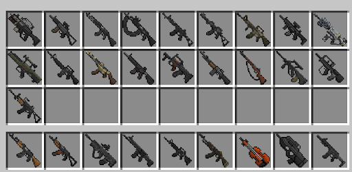 The characteristics of the weapon in these addons for mincraft are determined: the rate of fire of the weapon, mass, capacity, damage, accuracy, working radius. To defeat the enemy, the player must take these characteristics into account in mods mcpe. And then victory will be ensured in your world, in minecraft survival maps.
