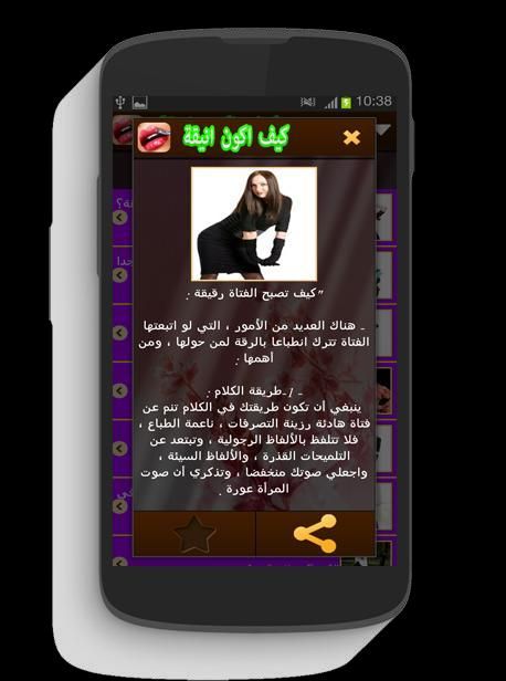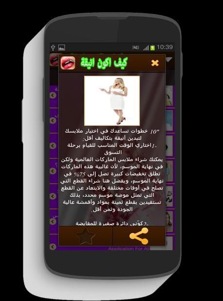 كيف أكون أنيقة برنامج مجاني بدون انترنت لتطوير الشخصية حيت سيساعدك على تحسين شخصيتك و لباسك من خلال مجموعة من الاقتراحات الهدف منها هو ان تصبحي انيقة و تتيري انتباه من حولك اضافة الى ان كل الوصفات في هدا التطبيق ال المجاني كيف اكون انيقة انها في مستو تناولك و طبيعية حيت ستخول لك معرفة كيفية التعامل في اغلب المواقف و بالتالي تحسني من اناقتك و شخصيتك بالاضافة الى جماللك الخارجي سيدتي.