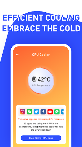 ★ Super Boost: နောက်ခံတွင်လည်ပတ်နေသောဖြစ်စဉ်များကိုအလွယ်တကူရပ်တန့်ပြီးဖုန်းကိုပိုမိုထိရောက်စွာရပ်တန့်နိုင်သည်။ ★ CPU Cooler: CPU ၏အပူချိန်ကိုစစ်ဆေးပြီးစောင့်ကြည့်လေ့လာပါ။ CPU ကိုသုံးစွဲရန်နှင့်သင့်အားလုံခြုံစွာအသုံးပြုနိုင်သည့်လုပ်ငန်းစဉ်ကိုရပ်တန့်ပါ။ ि >