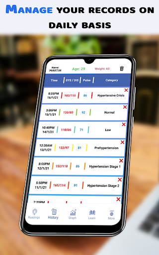 သင်ထည့်သွင်းထားသည့်တန်ဖိုးများအားလုံးကိုစဉ်ဆက်မပြတ်သိမ်းဆည်းထားပြီးသင်မည်သည့်တန်ဖိုးကိုမဆိုနေ့စွဲဖြင့်ထည့်နိုင်သည်။ ၎င်းသည်သင်ရိုက်ထည့်သောတန်ဖိုးများအပေါ် အခြေခံ. အန္တရာယ်ဂရပ်များကိုလည်းပြသသည်။ သင်၏နှလုံးသား၏မှန်ကန်သောမှတ်တမ်းကိုထိန်းသိမ်းရန်သင်၏ BP နှင့် Pulse နှုန်း၏မှန်ကန်သောတန်ဖိုးများကိုထည့်ပါ။ သင်ထည့်သွင်းထားသည့်နှာခေါင်းနှင့် diastolic တန်ဖိုးကို အခြေခံ. အန္တရာယ်များကိုခွဲခြမ်းစိတ်ဖြာရန်အလေးချိန်နှင့်အသက်အရွယ်ယူရန်အသက်အရွယ်ယူသည်။