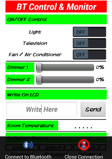 Using this application you can turn on and off three types of actuators: Light(ON/OFF) , Television(ON/OFF) and Fan(ON/OFF)