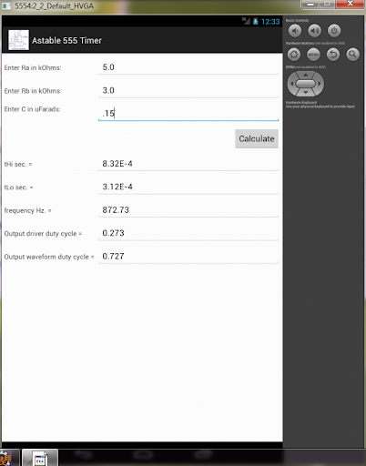 Input Ra, Rb (in kOhms) & C (in uFarads) then push the Calculate button to get the values for the output high-level duration tH and low-level duration tL and frequency.
