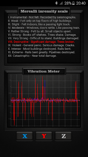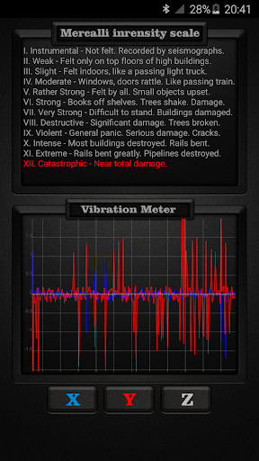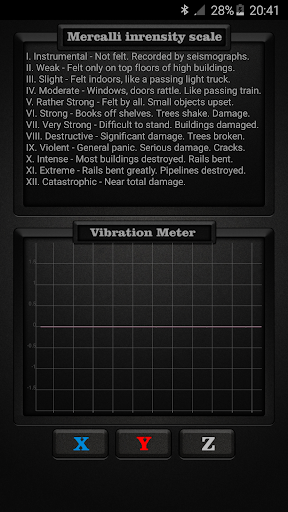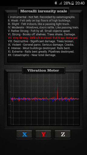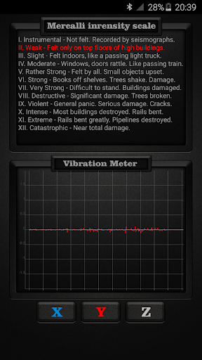 တုန်ခါမှုမီတာသည်သင်၏ device ၏အာရုံခံကိရိယာများကိုပုဆိန်များပေါ်တွင် သုံး. vibrations ကိုအသုံးပြုသည်။ x, Y, Z နှင့်ငလျင်လှုပ်ခြင်းစသည့်ငလျင်လှုပ်ခြင်းကဲ့သို့သောနိုင်ငံတကာအခြေစိုက် Mercalli ကိုအသုံးပြုသော Mercalli အားပြင်းထန်မှုအတိုင်းအတာဖြင့်ခွဲခြားထားသည်။ Mercalli ပြင်းထန်မှုစကေးသည်ငလျင်လှုပ်ခြင်းကြောင့်အသုံးပြုသောငလျင်အတိုင်းအတာဖြစ်သည်။ ၎င်းသည်ငလျင်၏ဆိုးကျိုးများကိုတိုင်းတာသည်။ တုန်ခါမှုမီတာများကိုငလျင်လှုပ်ခြင်းလုပ်ငန်းကိုတိုင်းတာရန်အသုံးပြုသည့်အခါအသုံးပြုသောအခါ seiscograph သို့မဟုတ် seismometer ဟုလည်းခေါ်သည်။