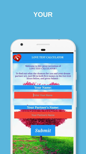 LOVE TEST CALCULATOR is an android application love detector with which you can measure the percentage of love compatibility and chances of successful relationship between two people.