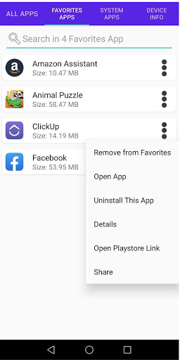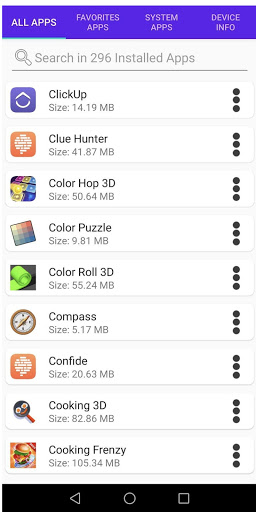 1 ။ အက်ပ်များအားလုံးကိုစာရင်းပြုစုပါ။ သင်၏တပ်ဆင်ထားသောအက်ပ်များအားလုံးကိုသင့်ဖုန်းတွင်တွေ့နိုင်သည်။ သင်အက်ပ်များကိုရှာဖွေနိုင်သည်။ ထို့အပြင်သင်၏အက်ပ်များကိုဖွင့်နိုင်သည်, အက်ပ်၏အသေးစိတ်ကိုကြည့်နိုင်သည်, App ကို Click တစ်ခုဖြင့် uninstall လုပ်နိုင်သည်, Playstore link ကိုဖွင့်နိုင်သည်။