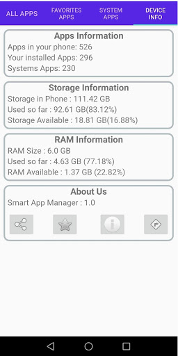 4 ။ Device Info: သင်၏ device storage statics များ, RAM အသုံးပြုမှုစာရင်းများကိုတစ်နေရာတည်းတွင်တွေ့နိုင်သည်။