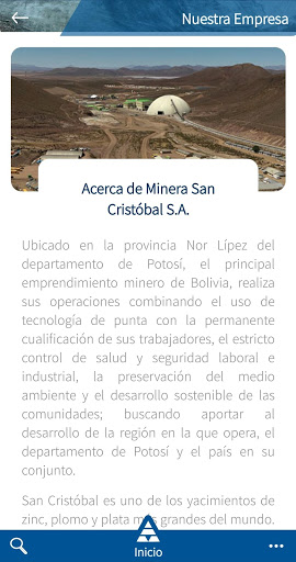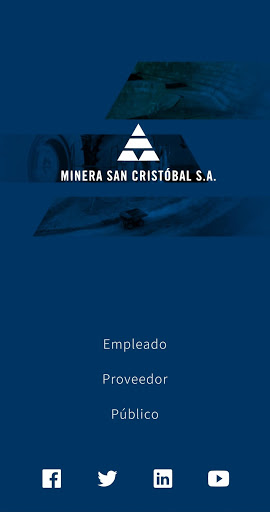 La aplicación móvil de Minera San Cristóbal permite acceder a información institucional y noticias recientes con respecto a la empresa. También permite acceso a diferentes funcionalidad útiles para los empleados de la Minera San Cristóbal, adicionalmente los proveedores de la empresa también pueden ingresar para revisar información administrativa.