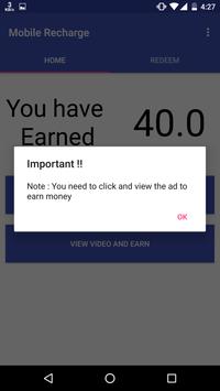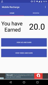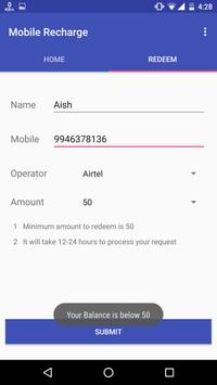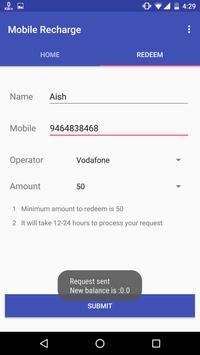 After you reach threshold of rs 50 recharge request can be sent in redeem tab.