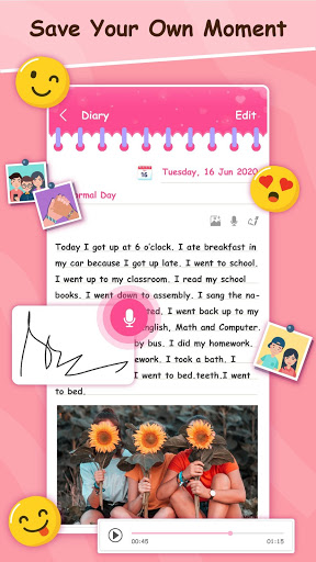 This app will let you write text, add images, videos, voices & signature to your diary.