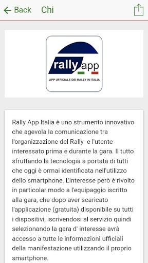 Rally App Italia è uno strumento innovativo che agevola la comunicazione tra l'organizzazione e l'utente interessato alla gara. Il tutto sfruttando la tecnologia a portata di tutti che oggi è ormai identificata nell'utilizzo dello smartphone. L'interesse però è rivolto in particolar modo a l'equipaggio iscritto alla gara, che dopo aver scaricato l'applicazione (gratis) disponibile su tutti i dispositivi, iscrivendosi al servizio quindi selezionando la gara d'interesse avrà accesso a tutte le informazioni ufficiali della manifestazione direttamente dallo smartphone.