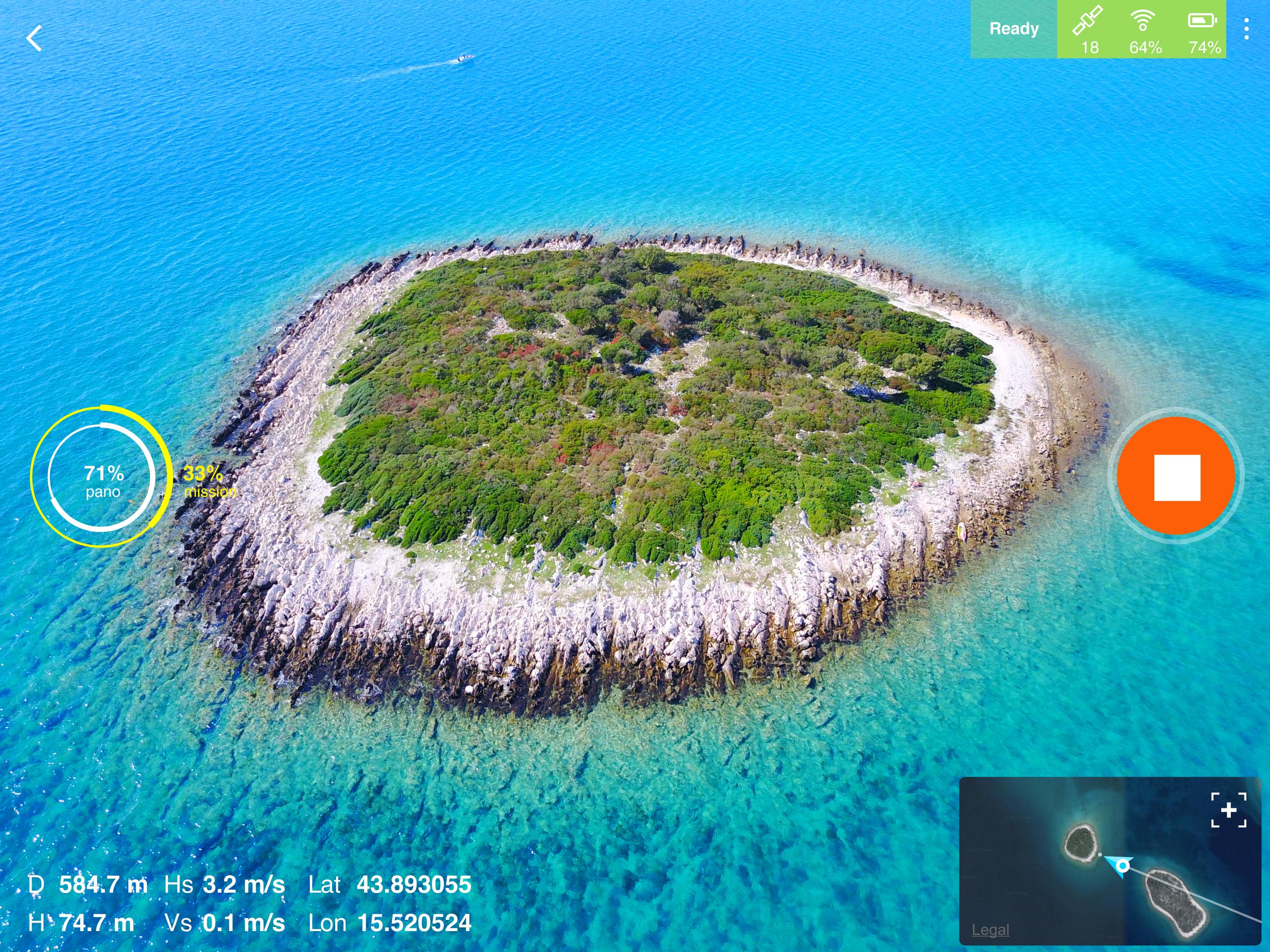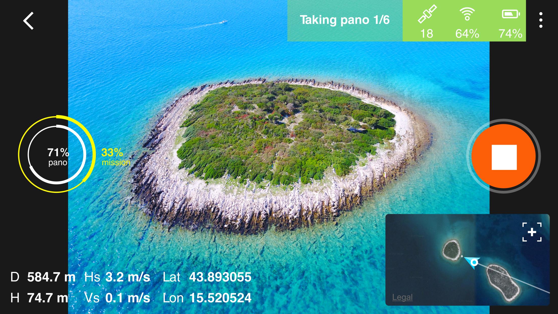 • app automatically takes off, flies your DJI drone to each waypoint and takes all photos necessary for perfect 360° panos