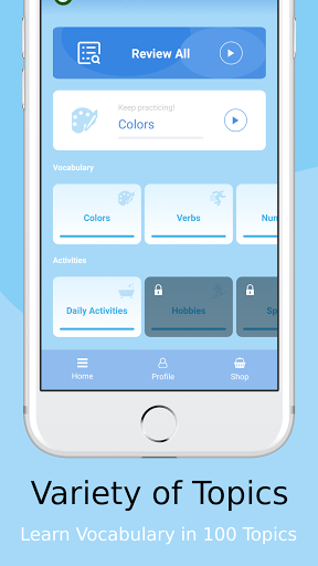Learn words from over 100 different topics using a variety of different techniques that will help you to remember. From Flash Cards to Listening Games to Quizzes, Vocly will keep you on your toes.