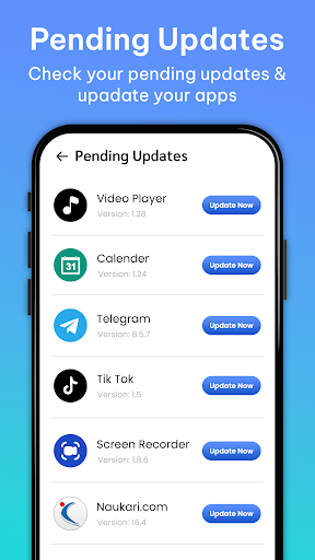 သင်၏ဖုန်းသည်အက်ပလီကေးရှင်း 50 ကိုတပ်ဆင်ထားပါ။ဤအတွက်သင် Play Store တွင် app updates များကိုအကြိမ်ပေါင်းများစွာစစ်ဆေးရန်မလိုအပ်ပါ။ဆိုင်းငံ့ထားသော Updates appextates များကိုဤဖုန်းမွမ်းမံမှုအက်ပလီကေးရှင်းနှင့်အလိုအလျောက် ပြုလုပ်. သင်၏လျှောက်လွှာများကို အသုံးချ. အဆင့်မြှင့်တင်ထားသောအက်ပ်များစာရင်းကိုသင်ရိုးရိုးရှင်းရှင်းရနိုင်သည်။လျှောက်လွှာကိုဖွင့်ပြီး App List မှသင် update လုပ်လိုသည့် app ကိုနှိပ်ပါ။စာရင်းကို install လုပ်ထားသော application, system application & amp အဖြစ်ခွဲခြားထားသည်။ဆိုင်းငံ့ updates များကို။သင်၏အက်ပ်များနှင့်ဂိမ်းများအားလုံးကိုထိတွေ့မှုတစ်ခုဖြင့်အဆင့်မြှင့်ပါ။