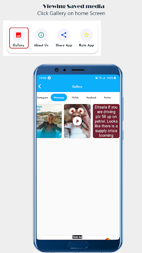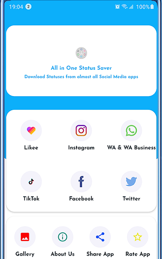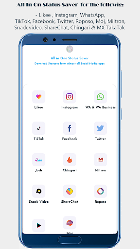 ဆိုရှယ်မီဒီယာပလက်ဖောင်းအားလုံးနီးပါးအတွက်အားလုံး status saver တစ်ခုတွင်အားလုံးသည်လူမှုရေးမီဒီယာဗီဒီယိုများနှင့်ရုပ်ပုံများကို download လုပ်ရန်အခမဲ့ Android app တစ်ခုဖြစ်သည်။ ၎င်းသည် WhatsApp, Likee, Facebook, Josh, Chingari, Miltragon, MiltoSo, MOPOSO, MOPOSO, MOPOSO, MOPOSO, MOPOSO, MOPOSO, MOPOSO, MOPOSO, MOPOKAK, MOP နှင့် Twitter တို့ကအားလုံးဖြစ်သည်။ ၎င်းသည်အက်ပလီကေးရှင်းမှအလွယ်တကူမျှဝေရန်လည်းအင်္ဂါရပ်ကိုလည်းပေးသည်။ အက်ပလီကေးရှင်းကို download လုပ်ပြီး application တစ်ခုတွင်အင်္ဂါရပ်များအားလုံးကိုရယူပါ။ ၎င်းသည်အရွယ်အစားသေးငယ်သောအရွယ်အစားနှင့်ပါ 0 င်သည်။ ထို့ကြောင့်၎င်းသည်၎င်းကိုအဆင့်မြင့် saver သို့မဟုတ် video-status downloader တွင်ထည့်သွင်းထားသည်။ လျှောက်လွှာတွင်သိမ်းဆည်းထားသော status status, videos နှင့်ရုပ်ပုံများအားလုံးအတွက်ပြခန်းလည်းရှိသည်။